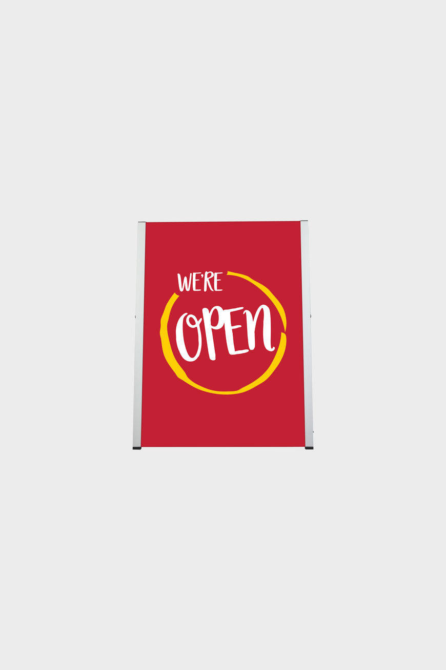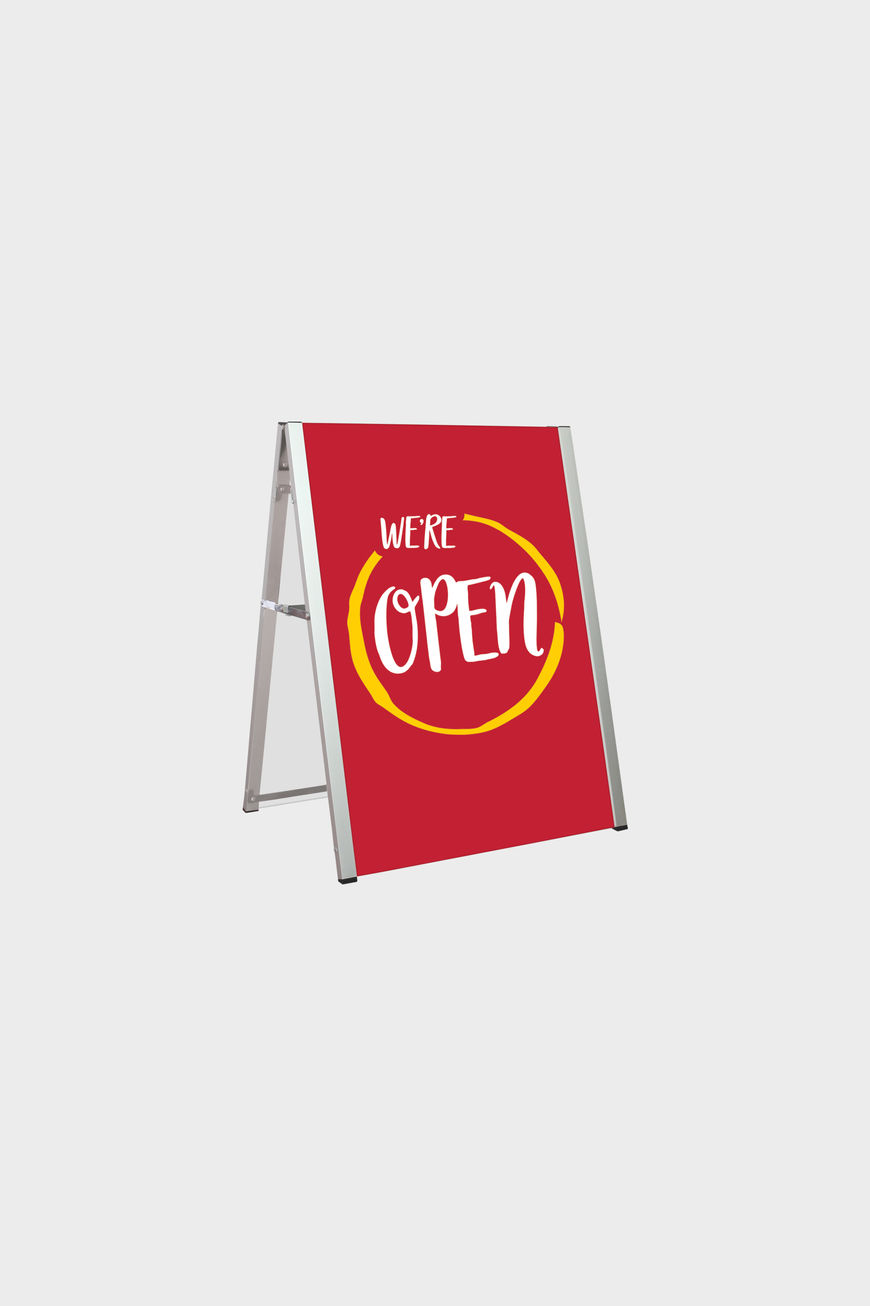 The Ace Eco Outdoor Sign is a foldable A-frame sign ideal for use curbside, near storefronts, on sidewalks and more. The Ace Eco features an aluminum frame that holds two rigid boards. Choose from printed 6mm PVC boards or printed dry-erase boards or both! Simply open the frame, straighten the arms on the sides, and slide the boards into the frame at the top. Dry erase boards can be printed on and allow for messages to be easily written on or erased!
